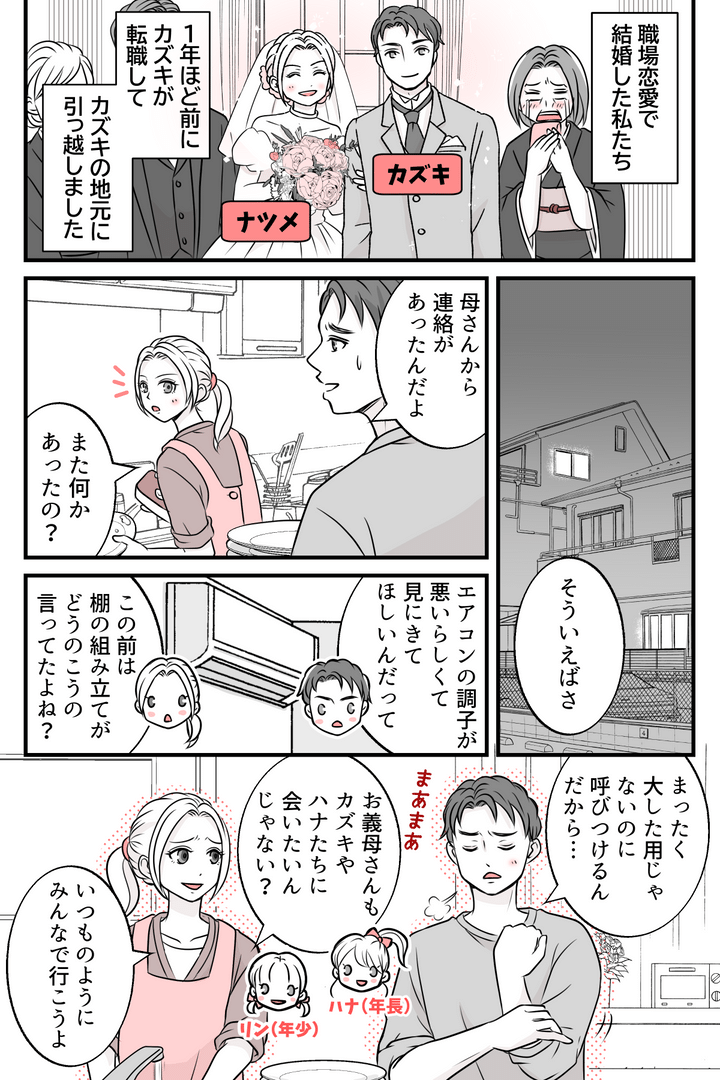 私はナツメ。夫のカズキとのあいだには幼稚園に通う娘が2人(年長のハナ、年少のリン)います。1年ほど前にカズキが転職して、カズキの地元に家族全員で引っ越すことになりました。義母の強い希望もあり、私たちはカズキの実家の近くに住むことに。義母は私たちの結婚式でも感動したのか大泣きしていましたし、きっとカズキのことが本当に大切なのでしょう。せっかく近くに引っ越したのですから、私たちも義母とより仲よくなれたらいいなと思っています。