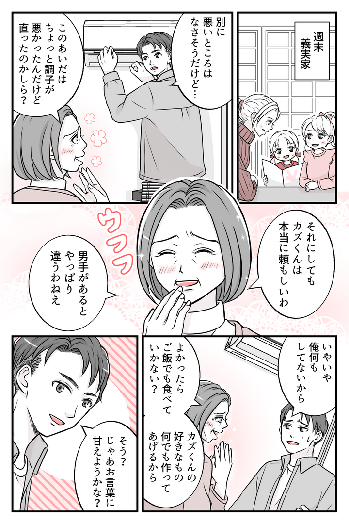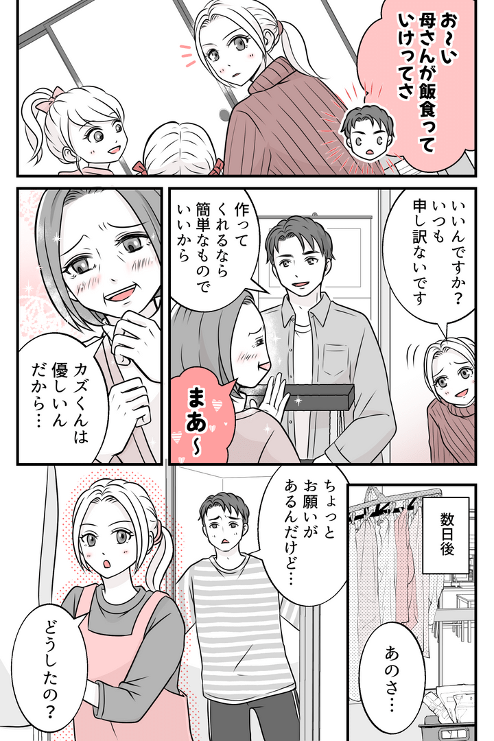 私たちが義実家に行くと、いつも義母は夕飯を用意してくれます。この日も義母の厚意に甘えて、私たち家族は義実家で夕飯を食べて帰ることにしました。それから数日後、カズキがなんだか言いづらそうに話しかけてきました。