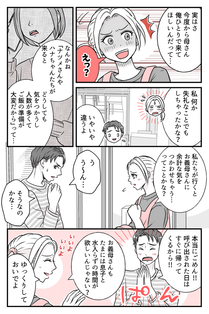 しかしカズキから「今度から俺ひとりで来てほしいんだって」と告げられ、驚いてしまいました。ひょっとしたらこれまでは、私が建前を真に受けて甘えていたのかもしれません。