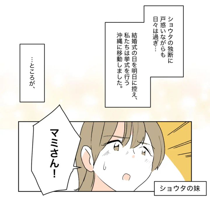 その後、ショウタの独断に戸惑いながらも日々は過ぎ・・結婚式の日を明日に控え、私たちは挙式を行う沖縄に移動することに。ところが・・。