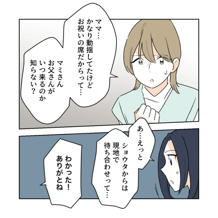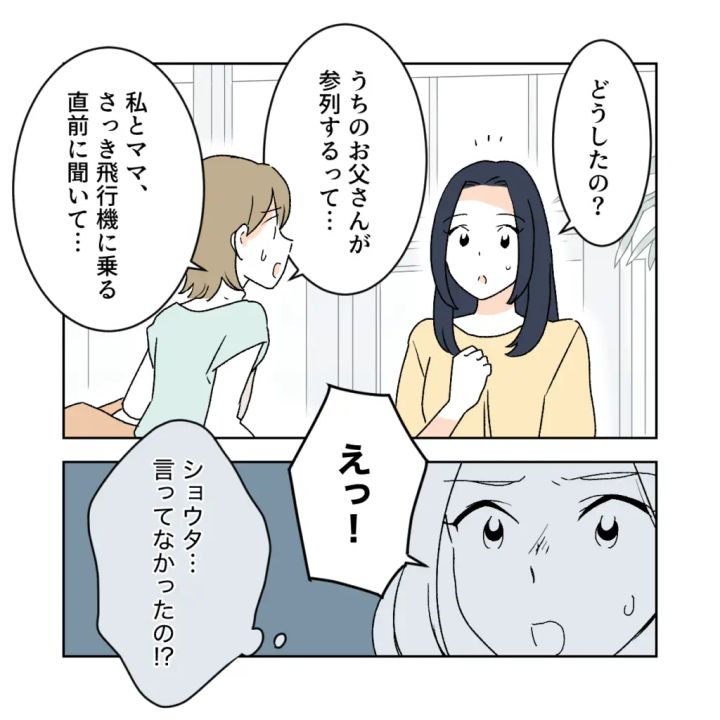 「どうしたの?」とたずねると、「うちのお父さんが参列するって・・。私とママ、さっき飛行機に乗る直前に聞いて・・」と言われ、「えっ!」と驚く私は「ショウタ・・言ってなかったの!?」とビックリ。