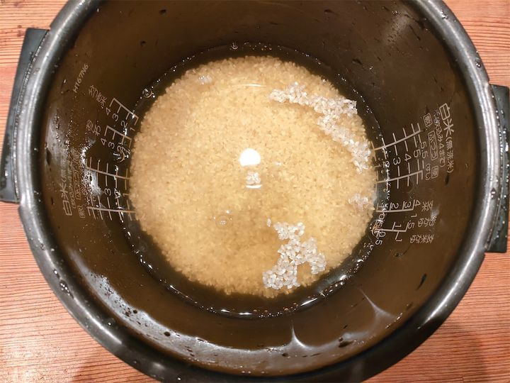 4. 3の上にすべての材料をのせて、普通炊きモードで炊く。