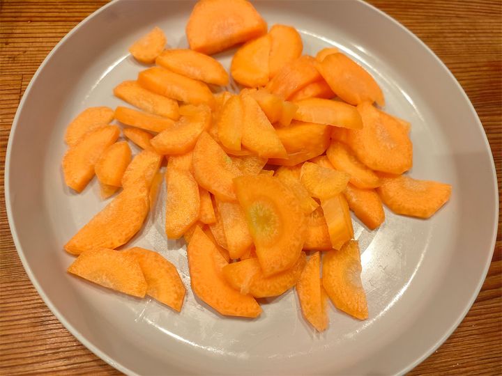 1. じゃがいもは皮を剥き、食べやすい大きさに切って水にさらす。にんじんは皮を剥き、3mm程度の半月切りに。しめじは石づきを切って手で小房に分ける。