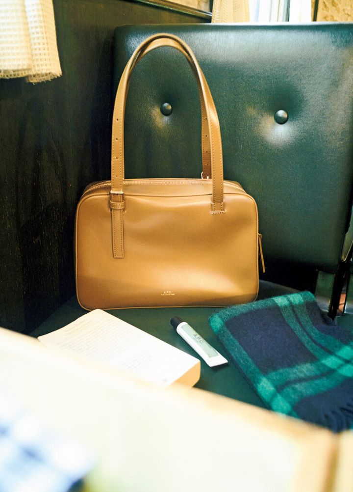 スクエア型のフォルムにゴールドの刻印と、アイコニックな〈A.P.C.〉のバッグはシンプルながら使い勝手がいい。その形ゆえに容量は十分で内ポケット付きだし、ハンドルは長さを調節できるから手持ちにも肩掛けにもできる。そして取り外し可能なストラップ付き。ショルダーバッグのようにも使えて、コーディネートに合わせて自由自在。[W28×H18×D10㎝]¥93,500(アー・ペー・セー カスタマーサービス 0120−500−990) マフラー¥52,800(ジョシュアエリス/真下商事 03−6412−7081) その他スタイリスト私物
