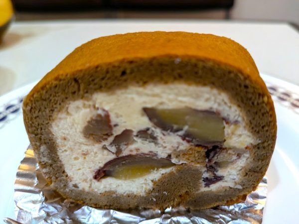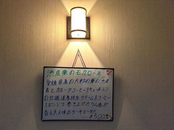 渋皮栗のモカロール 500円 愛媛県産の大粒の栗の渋皮煮とカルーアコーヒーリキュール入りの北海道産純生クリームをコーヒースポンジで巻き上げたラム酒が香る、爽やかな酸味と甘みとコクのあるモカロールです。おいしかったです。るなるな、京橋に本日のデザートを食べる楽しみができました。(笑)