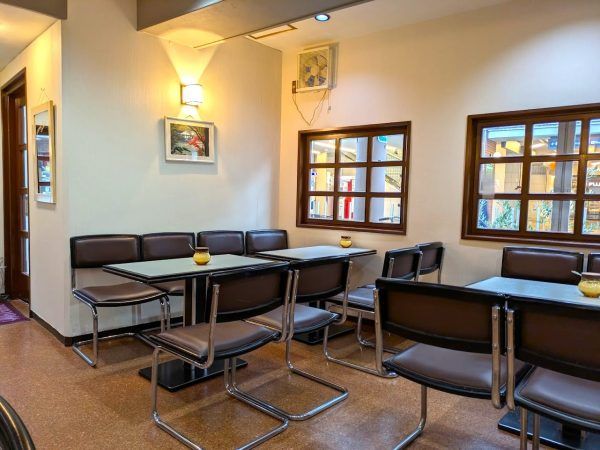 店内は、広く、テーブル席とテーブル席の間隔も広く、落ち着いた空間です。窓が多く自然光が入る素敵な珈琲亭です。