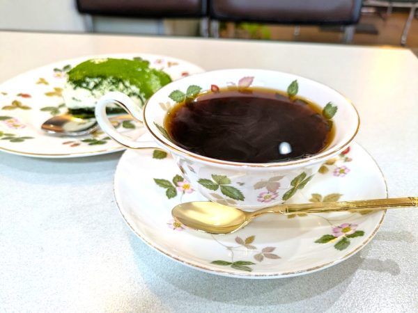 アメリカンコーヒー 450円 ケーキのお皿とコーヒーのカップ&ソーサーはWedgwoodです。可愛らしいですね。ドリンクセットなので50円引きです。