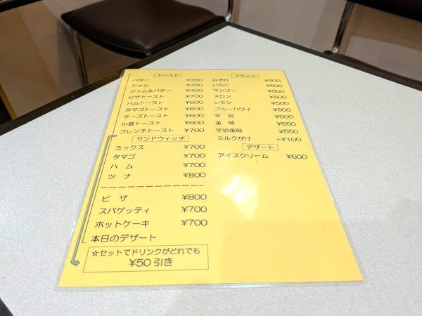 トースト・サンドイッチ・ピザ・スパゲッティ・ホットケーキ・かき氷・アイスクリーム・本日のデザートです。セットでドリンクがどれでも50円引きです。