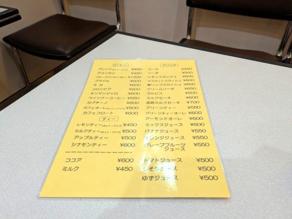 珈琲亭のドリンクメニューは、コーヒー・ティー・ソフトドリンクと種類豊富です。