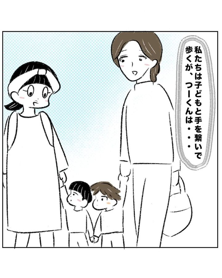 どんどん離れていくつーくんを見て心配になったまるさんは「ねぇ、つーくんめっちゃ遠くまで一人で行ってるよ。危ないから呼んで手繋いだ方がいいよ」とつーくんママに言いました。