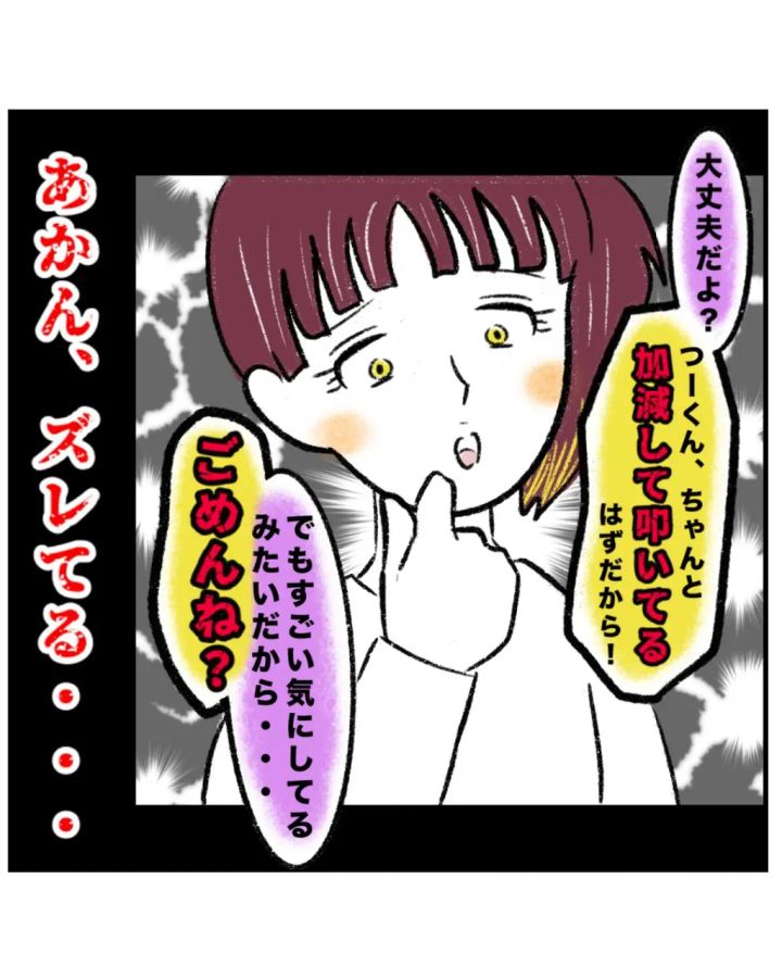 自分の子どもが一方的にお友達を叩いたのに、まったく悪びれず「加減して叩いてるから大丈夫」とズレた発言をするつーくんママにまるさんは唖然。