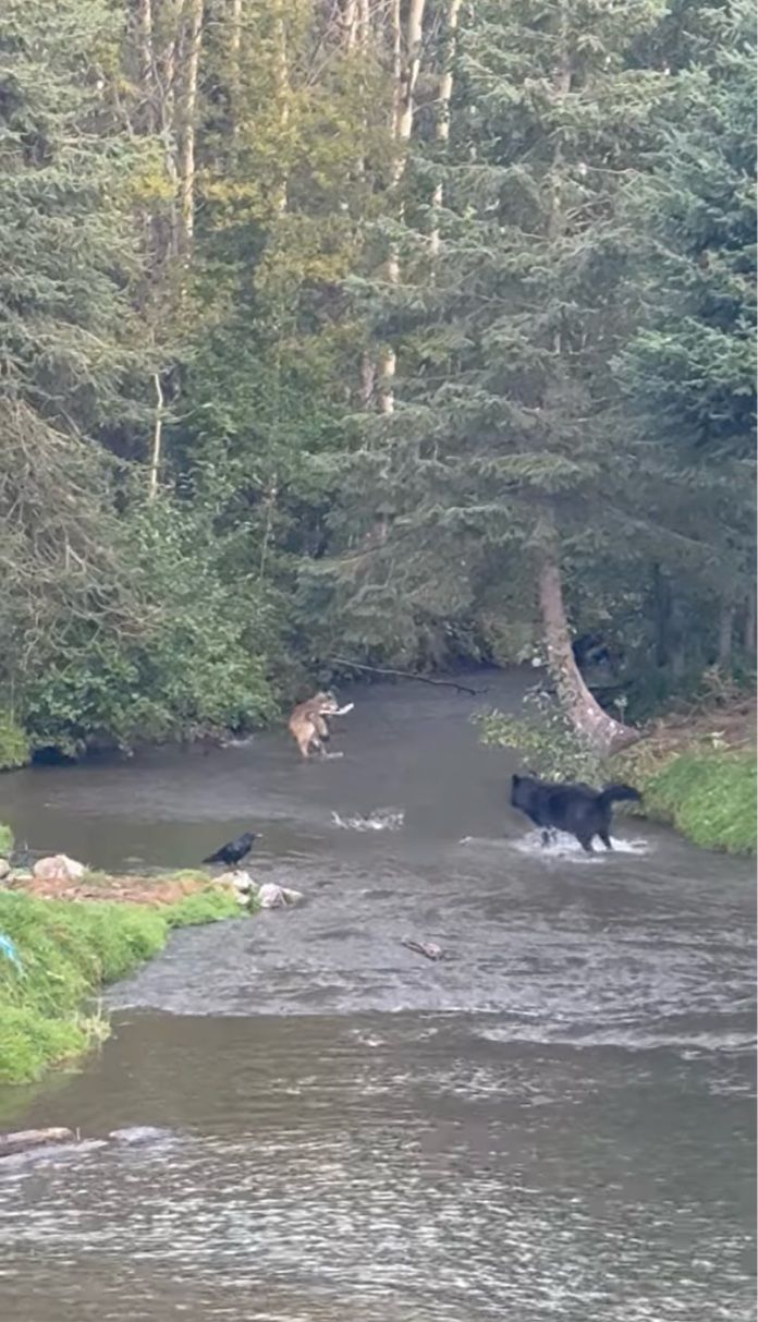 川のほとりで1匹のオオカミがじっと様子をうかがっています。 すると、奥にいた別のオオカミが勢いよく水の中へ飛び込んでいきました!