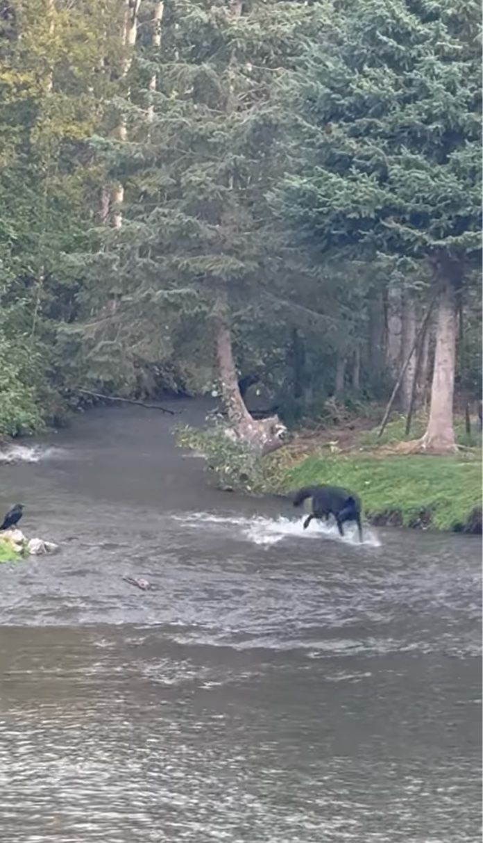 先ほど川のほとりにいたオオカミも、川に飛び込んで下流で魚を捕ろうとしています。