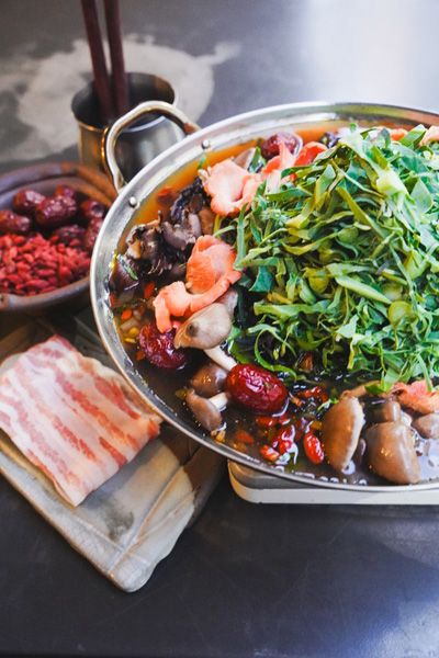 野菜に合う自家製スープが旬野菜の味わいを引き立てる鍋料理が人気です。8品の「抗酸化火鍋コース」は生薬成分と新鮮野菜を使用した薬膳風火鍋です。野菜のおかわりが自由なのはうれしいポイント。季節のサラダや焼き野菜2種盛り2皿、しめのフォー、デザートも付いています。