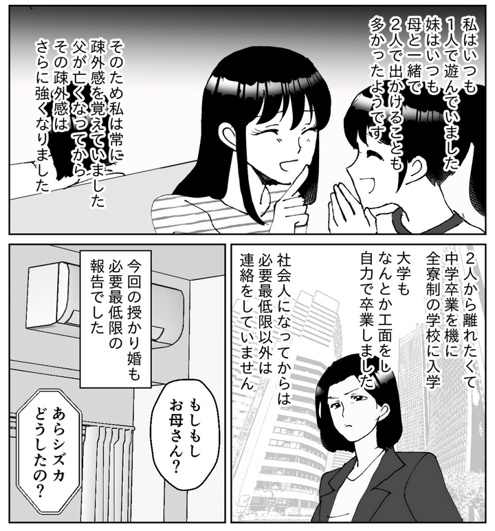 幼いころから母は妹ばかりを可愛がり、私は常に疎外感を覚えていました。気にしないようにはしていたものの、父の死後、その思いは強くなりました。