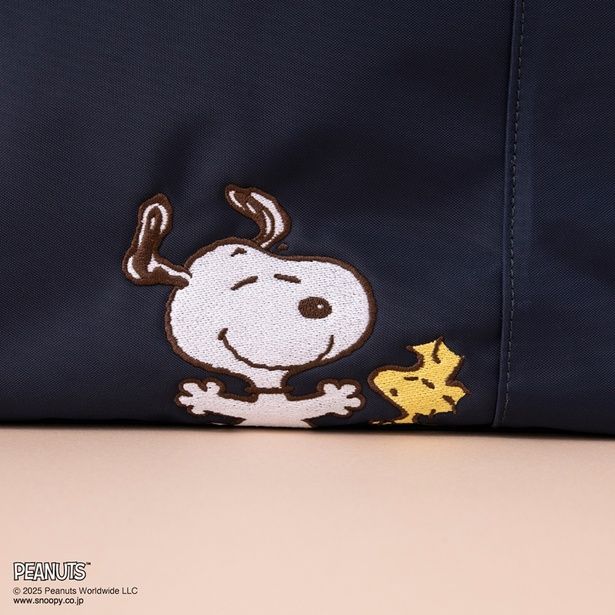 ハッピーダンスを踊るスヌーピーとウッドストックの上半身だけを刺しゅうで表現した「ナイロントートバッグ」(2万7500円)は、落ち着いたネイビーのみの1色展開。フェイクレザーを部分使いすることで、軽量なのにカジュアルすぎないムードなのもポイント!A4サイズもすっぽり入る大容量で、仕事にも普段使いにもぴったりのアイテム。