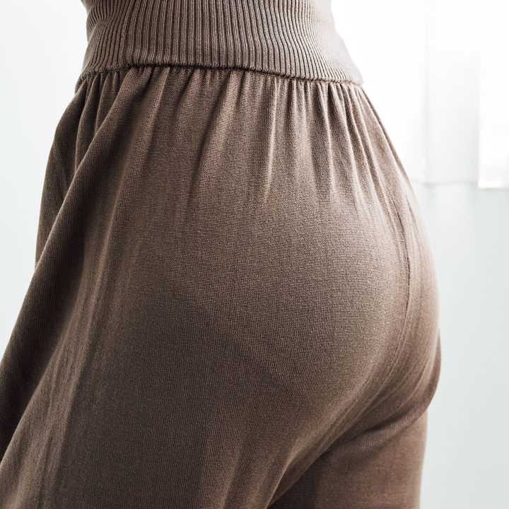 天然シルクから抽出された、純度の高いたんぱく質をニットにコーティング。脚にまとわりつかない落ち感シルエットなのでカジュアルすぎず、洗練された着こなしが可能。パンツ ¥16,940(+FT SUPREME.LA.LA.)コート ¥82,500<ケープホーン>バッグ ¥27,500<ノアム ハザン>靴 ¥39,600<デイト>(すべてティースクエア プレスルーム)カットソー ¥10,989(ドゥクラッセ)ピアス ¥13,200(ワンエーアールバイウノアエレ/ウノアエレ ジャパン)
