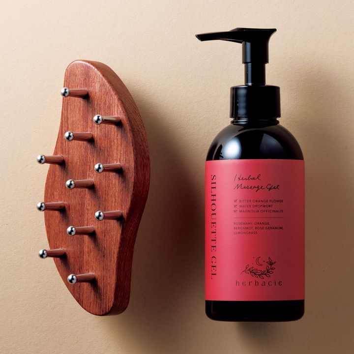 ジェルには3種類の植物由来の引き締め成分と天然精油8種を配合し、巡りを底上げ。ローズウッドのボディのかっさは、力の調整がしやすい形状なので初心者でも扱いやすい。