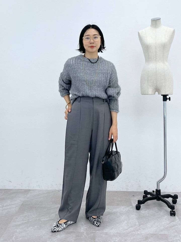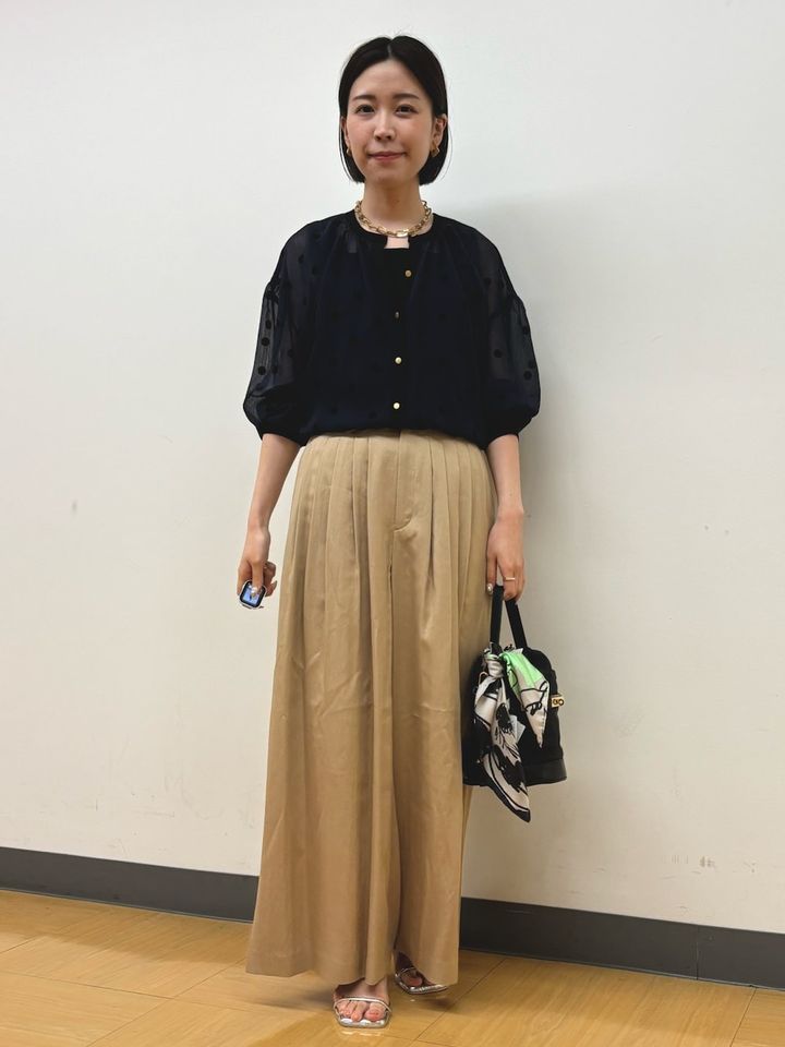 トップスはシアー素材で抜け感のあるダークカラーのカーディガンを合わせて、コンサバテイストをプラス。袖をロールアップし、トップスをコンパクトにまとめることで、ワイドパンツのボリュームがきれいに引き立ち、バランスのいい着こなしに。