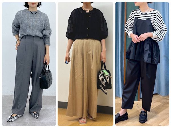 写真のような、スラックスとも呼ばれるタック入りのワイドパンツは、今シーズンも引き続きトレンド。腰まわりにはタックが入っているため少しゆとりがあり、筒が太いまま裾までつながっているため、すとんと落ちるようなシルエットに。脚をまっすぐきれいに見せてくれる効果も期待できます。