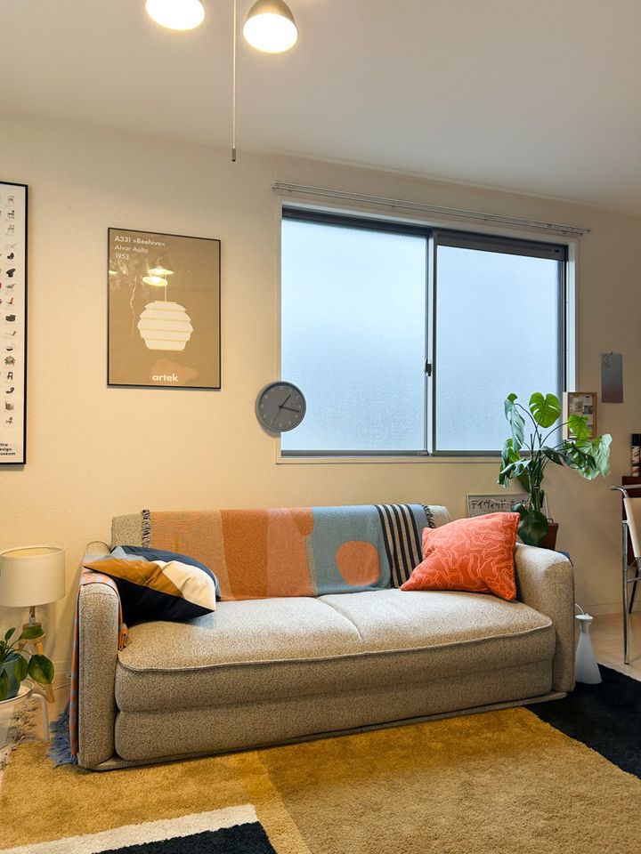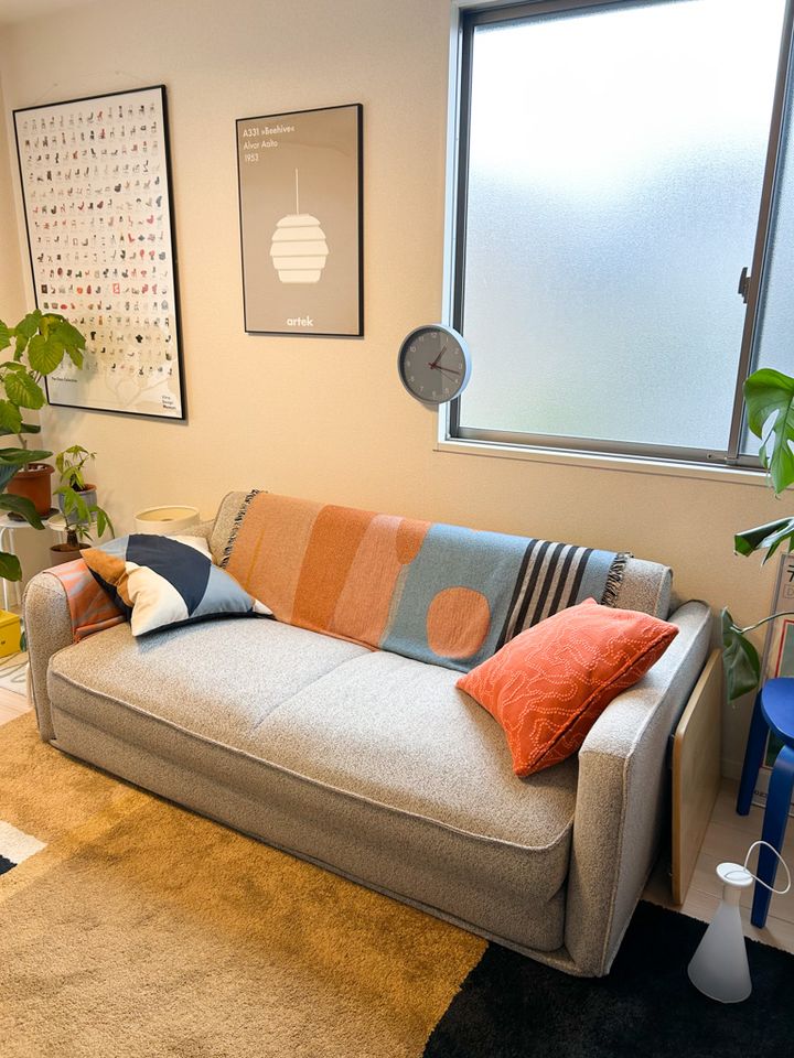 「少し硬めの大きなソファを探していて、ベッドとして利用できる点も含めて、自分の希望に合った商品だったので購入しました。色はシンプルなグレーに。ブランケットやクッションなどの小物で色を足したかったのでちょうど良い感じで気に入っています」