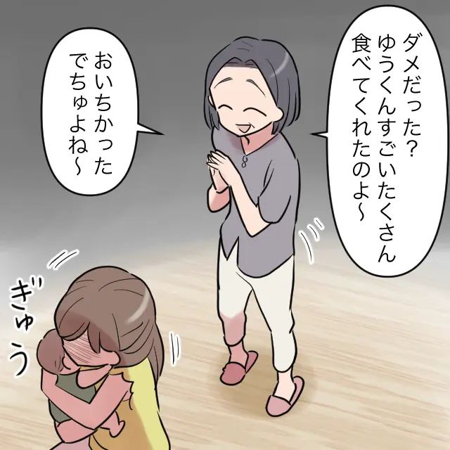 「ダメだった?ゆうくん、すごいたくさん食べてくれたのよ~。おいちかったでちゅよね~」と笑顔で言う義母をよそに、ゆうをギュッと抱きしめました。