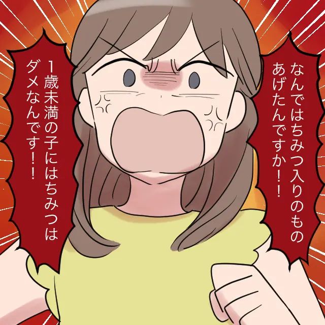 「なんではちみつ入りのものあげたんですか!!1歳未満の子にはちみつはダメなんです!!」と叫びました。