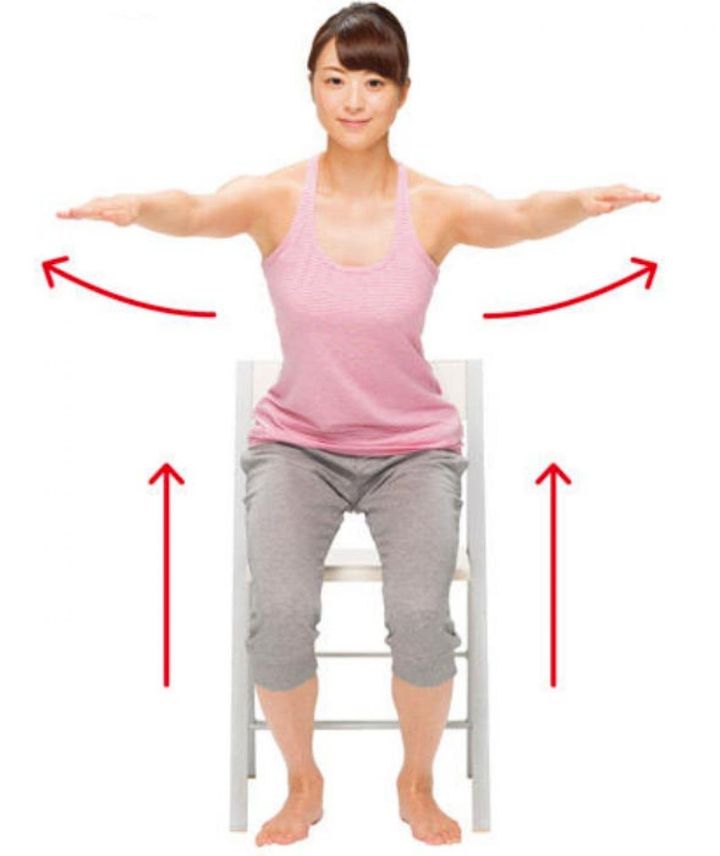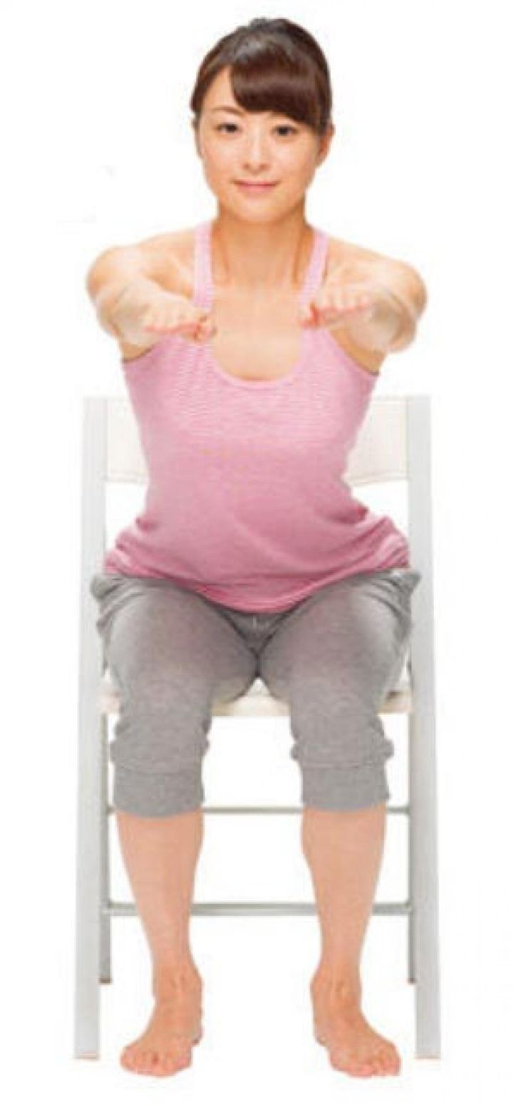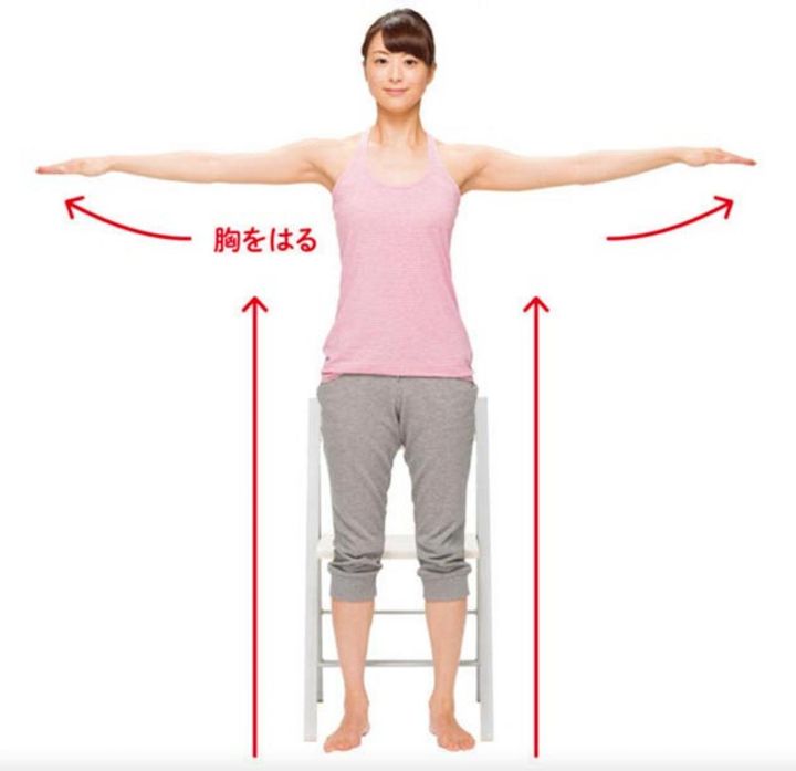 日常生活では意識しなければ肩や胸を開く動きをすることはないかもしれません。スクワットをしながら同時に肩の筋肉も動かしましょう。立ち上がりながら肩を後方へ大きく開くと、胸も大きく開きます。10回行うと肩が張るような感覚があるかもしれません。
