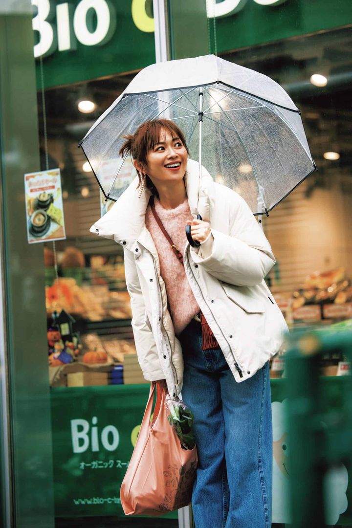 ダウンジャケット¥107,800(ウールリッチ/ウールリッチ 二子玉川店)ニット¥22,000(ウィム ガゼット/ウィム ガゼット 玉川髙島屋S・C店)デニムパンツ¥28,600(アッパーハイツ/ゲストリスト)ベルト¥13,200(レフィエ/フラッパーズ)バッグ¥126,500(J&M デヴィッドソン/J&M デヴィッドソン カスタマーセンター)ピアス¥39,600(リューク)マルシェバッグ¥1,100(ビオセボン/ビオセボン・ジャポン)傘/スタイリスト私物