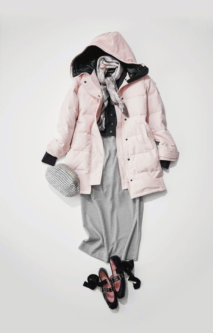 ピンクダウンコート¥242,000(カナダグース/カナダグースジャパン)ニット¥57,200(LOWER/ショールーム セッション)ラメスカート¥15,950(ジネス/ジオン商事)スカーフ¥22,000(マニプリ)バッグ¥55,000(ノアム ハザン/ティースクエア プレスルーム)シューズ¥60,500(プリティ・バレリーナ/F.E.N.)