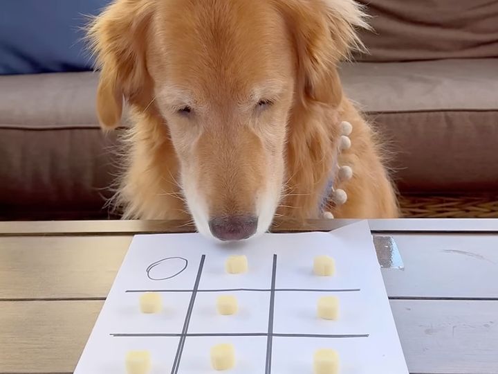 飼い主さんと○×ゲーム(三目並べ)に挑戦します。