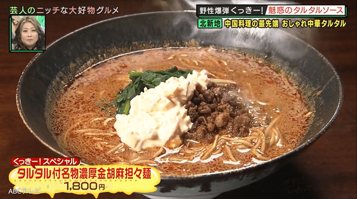 さらにオーナーシェフは、特製タルタルソースを好きなだけかけられる特別メニュー・名物濃厚金胡麻担々麺も作ってくれた。タルタルソースによって辛さがマイルドかつ絶妙な味わいになる、今までにない激うま担々麺だ。