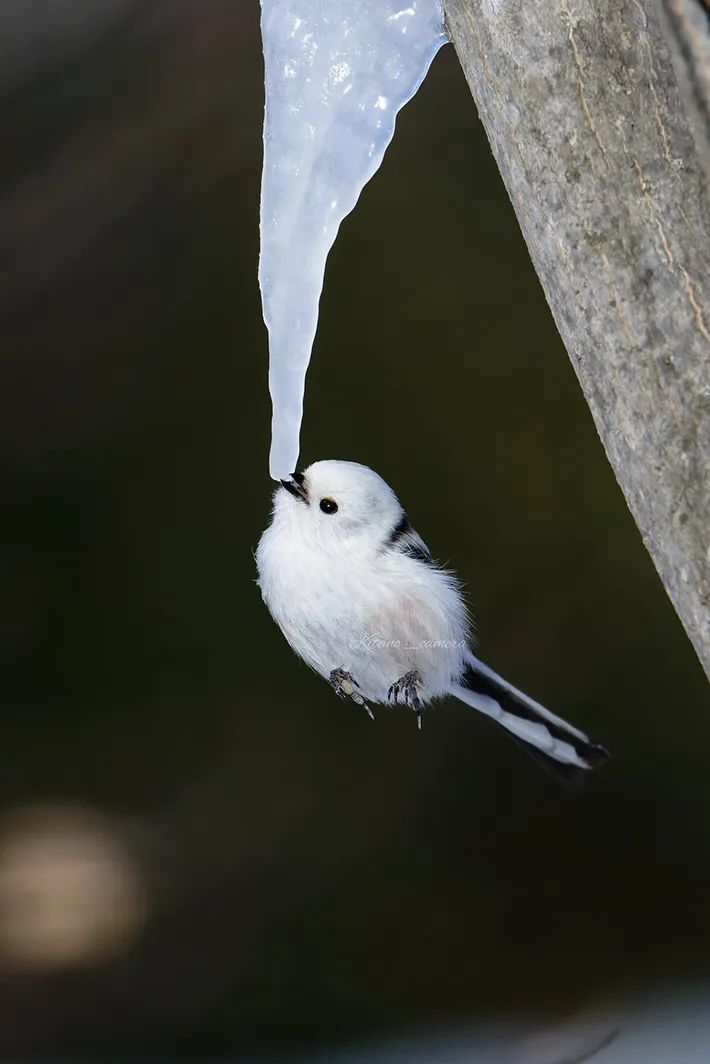 なかなか珍しい光景ですが、なぜシマエナガが氷柱を舐めているのか気になりますね。