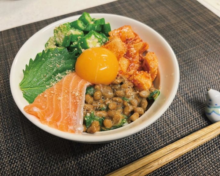 「体が重いなと感じたときは、お通じをよくする根菜やきのこを入れた豚汁を食べます。撮影前の追い込み時期は、豆腐の上にオクラや納豆をのせたネバネバ丼でよりヘルシーに!」