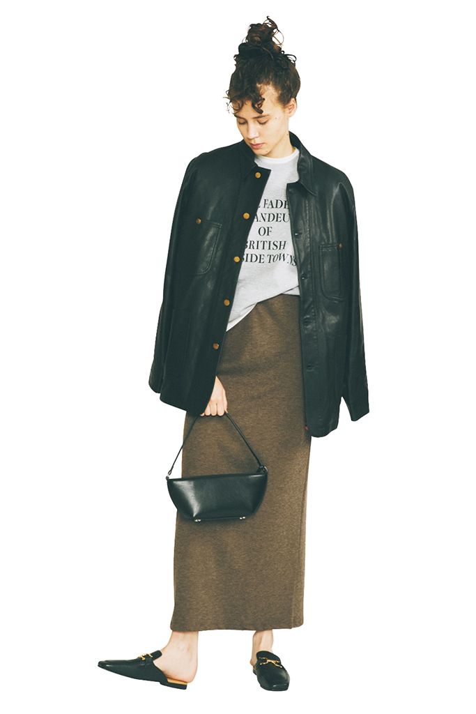 リラクシーなスエット+ニットが引き締まるレザーの強気な質感。ジャケットは肩にひっかける程度にとどめ、ルーズな装いを洒脱に仕上げて。 レザージャケットは着まわし。ロゴスエット/ハチイチブランカ(UTS PR) ニットスカート/MANGO シューズ/カミナンド(グラビテート)