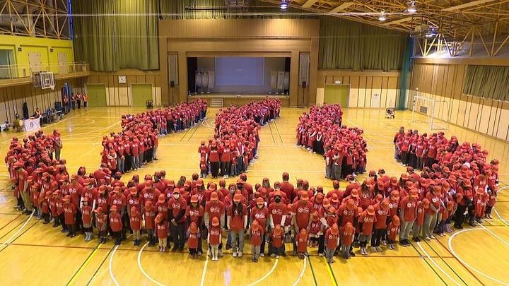 ちびっこも赤い帽子とTシャツで大集合!北海道の温泉のマチのマークで狙うは世界記録