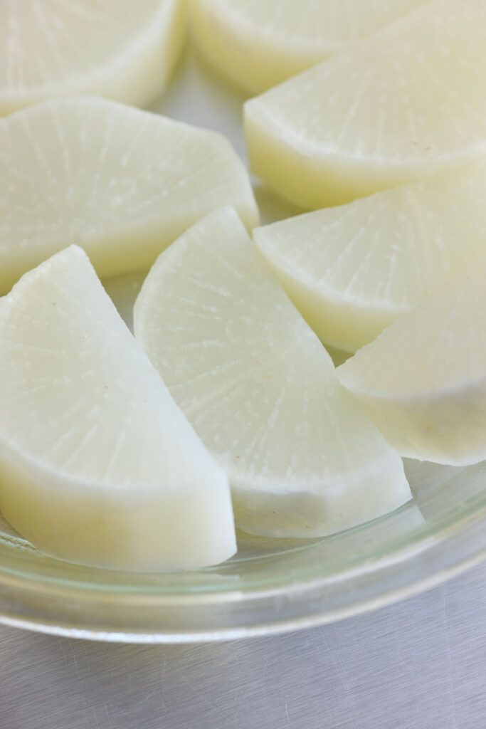 火を通すのにとくに時間がかかる大根は、下ゆでをして。レンジ加熱でOK。水分が抜けたところに煮汁が入って、ふっくらとします。薄切り肉は巻くと、野菜と火の通りがそろい、うまみを閉じこめられます。