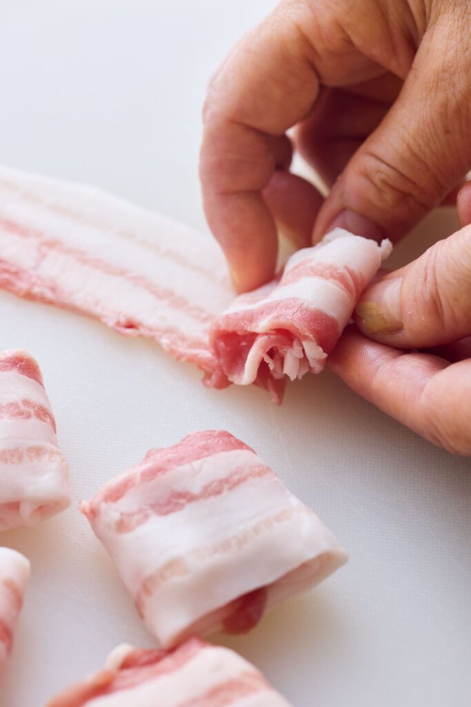 フライパンに1の豚肉を巻き終わりを下にして並べ入れ、中火にかける。かるく焼き色がつくまで2~3分さわらずに焼き、巻き終わりをくっつけて、火を止める。