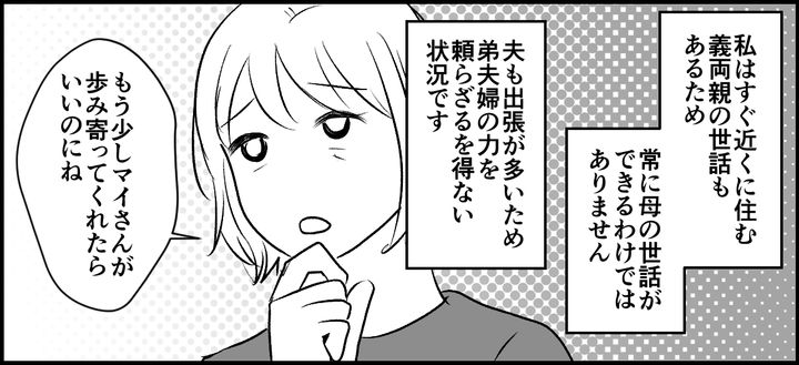 私(チエミ、50歳)は夫(スバル、50代)と2人で暮らしています。息子(カイ、29歳)と娘(ソラ、28歳)はそれぞれ独立し、働いています。近所に住む母(ユリエ、76歳)は10年前に脳梗塞で倒れ、後遺症が残りました。9年前に父が亡くなって以来、私は隣県に住む弟(リュウスケ、47歳)や義妹(マイ、39歳、弟嫁)と協力しながら母のサポートをしています。夫は長期出張が多いため頼れません。私は義両親(夫の両親、80代)の世話もあるため、弟夫婦の協力なしでは母の世話ができないのです。