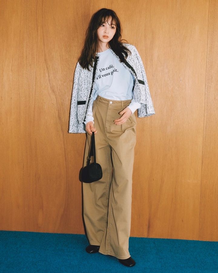 11月18日(火)、甘い印象のツイードジャケットは、今年らしくカジュアルダウンして着るのが気分。フレンチロゴTシャツとチノ素材のワイドパンツを合わせれば、上品さの中に抜け感が生まれて絶妙なバランスになります。ハイウエストのパンツにトップスをインして、スタイルアップも意識。足元は黒のフラットシューズで締めて、都会的な「甘辛コペンハーゲン風」スタイルが完成です。