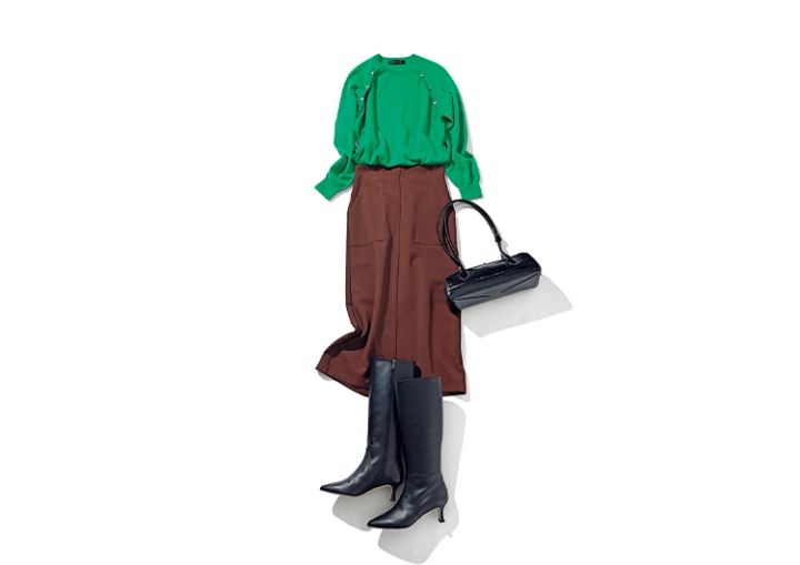初挑戦のグリーン×ブラウン、やってみたらいい感じ!色みはこれだけで十分だから、小物は黒で統一して。ミディ丈のスカートからブーツをのぞかせるのも、アップデート感が出てオススメなん です。