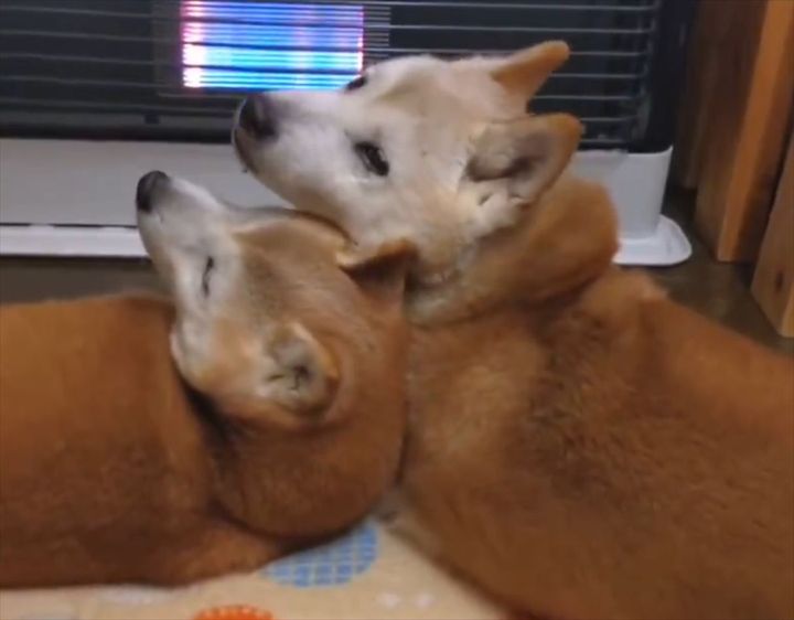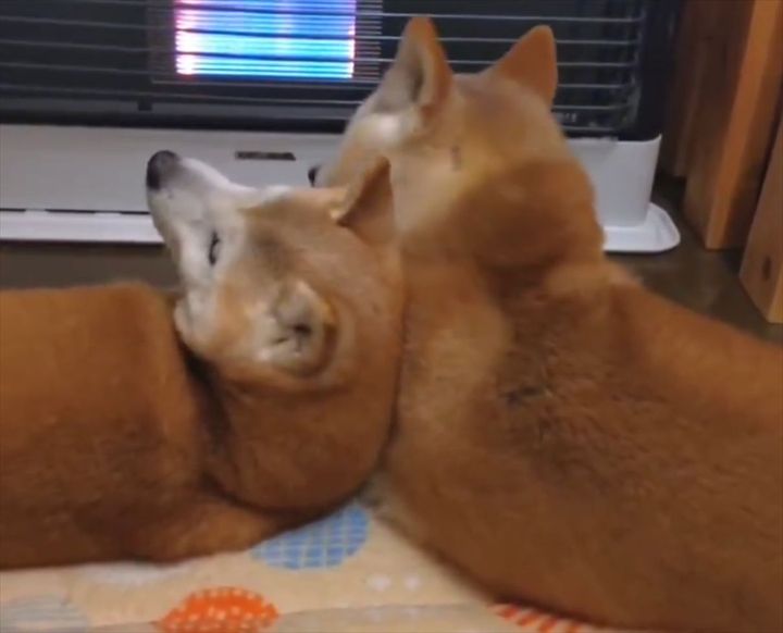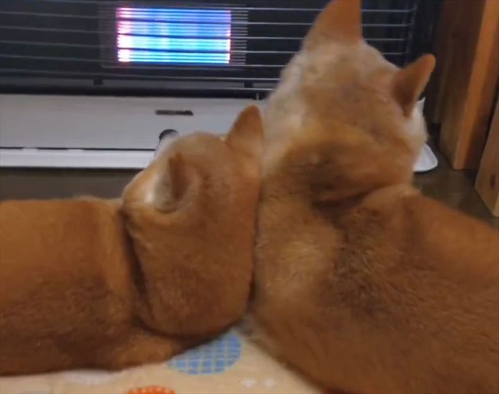ストーブ前で寄り添い、暖をとる2匹の柴犬。 そのかわいい姿が反響を呼んでいます!