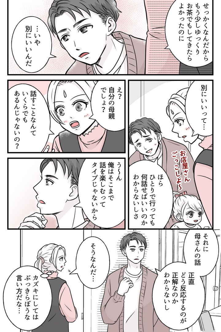 「もっとゆっくりしてくればいいのに」と声をかけると、カズキはどこか渋い顔をしました。どうやら義母と2人きりだと気まずいようなのです。