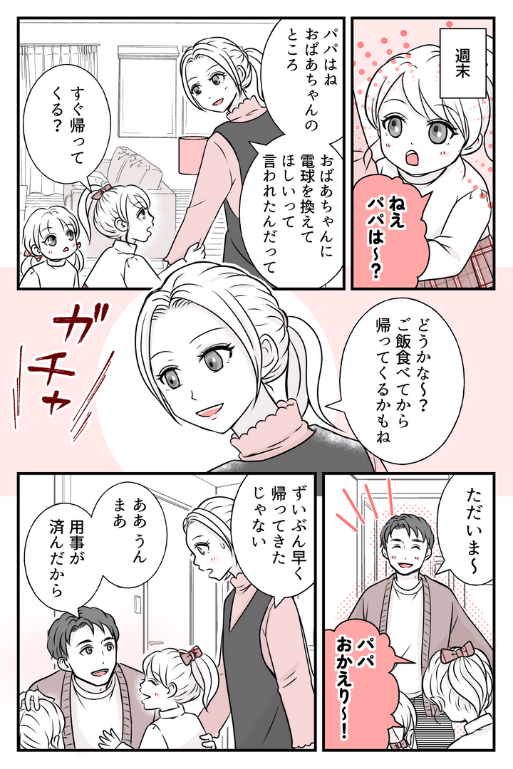 義母に言われたことで、カズキはひとりで義実家へ行くようになりました。子どもたちは休日にカズキがいなくて寂しそうですが、きっと義母だって寂しいのでしょう。カズキと親子水入らずの時間をゆっくり過ごしてくればいいと思っていたのですが、私の想像以上に早く帰ってきました。