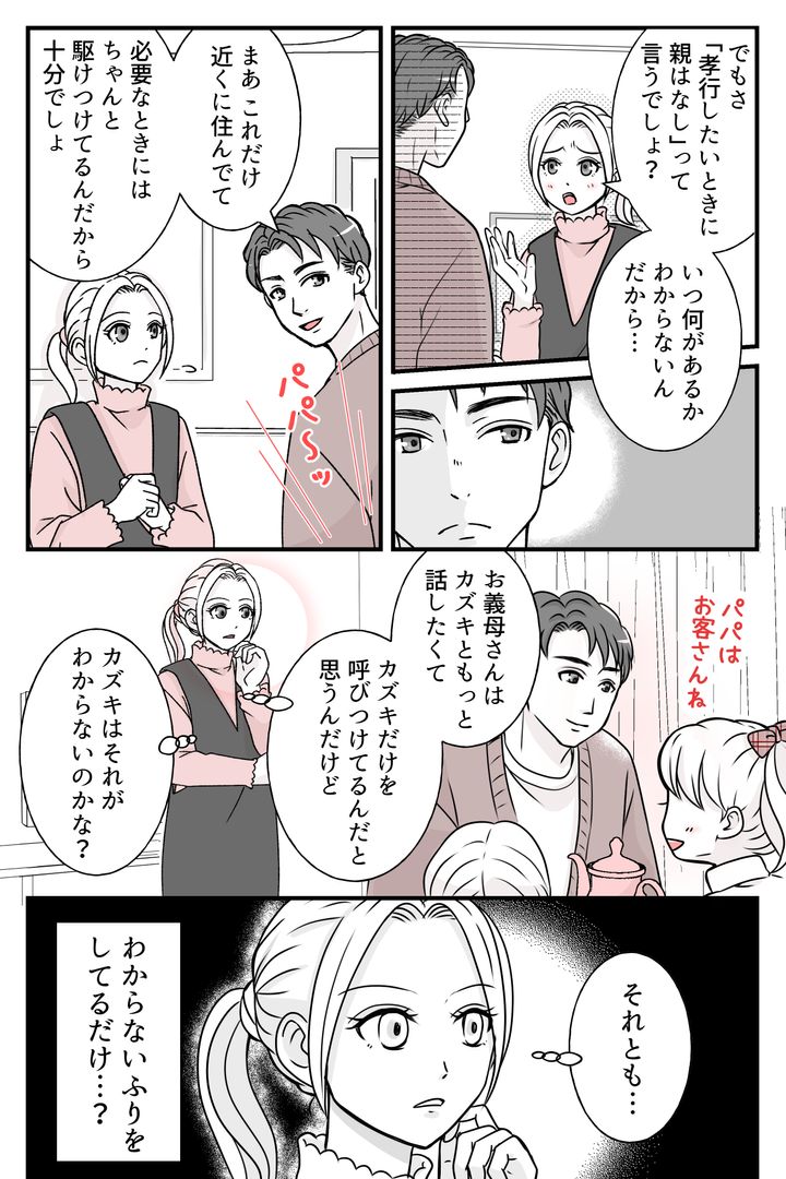 私はナツメ。夫のカズキとのあいだには幼稚園に通う娘が2人(年長のハナ、年少のリン)います。義母の近くに住むようになってから、義母は何かとカズキを呼び出します。その度家族みんなで出かけるのがわが家のお決まりになっていました。義母が寂しいのかもと思い、大変でも同行していたつもりです。しかしカズキから「今度から俺ひとりで来てほしいんだって」と告げられ、驚いてしまいました。ひょっとしたらこれまでは、私が建前を真に受けて甘えていたのかもしれません。義母は息子と水入らずの時間が欲しかったのでしょう。以来、カズキはひとりで義実家へ行くようになりました。