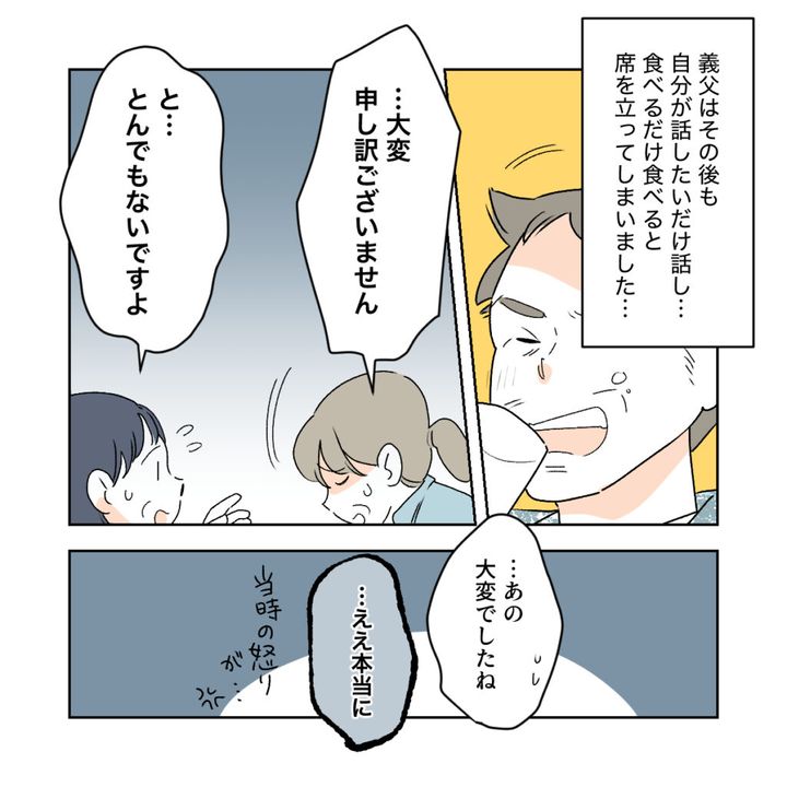 「お待たせ~」と義父を迎えに行ったショウタさんが戻ると、招かれざる客を見つめるように義父を見る義母と義妹。「お前だいぶ老けたな」とふざける義父にイライラが止まりません。その後、全員で食事をすることになるも、まるで義父がショウタさんを育てたかのように好き勝手に話す義父を見て、マミさんのお母さんに謝るも、当時の怒りがこみ上げる義母、本当、穴があったら入りたい気持ちでいっぱいでしょうね。