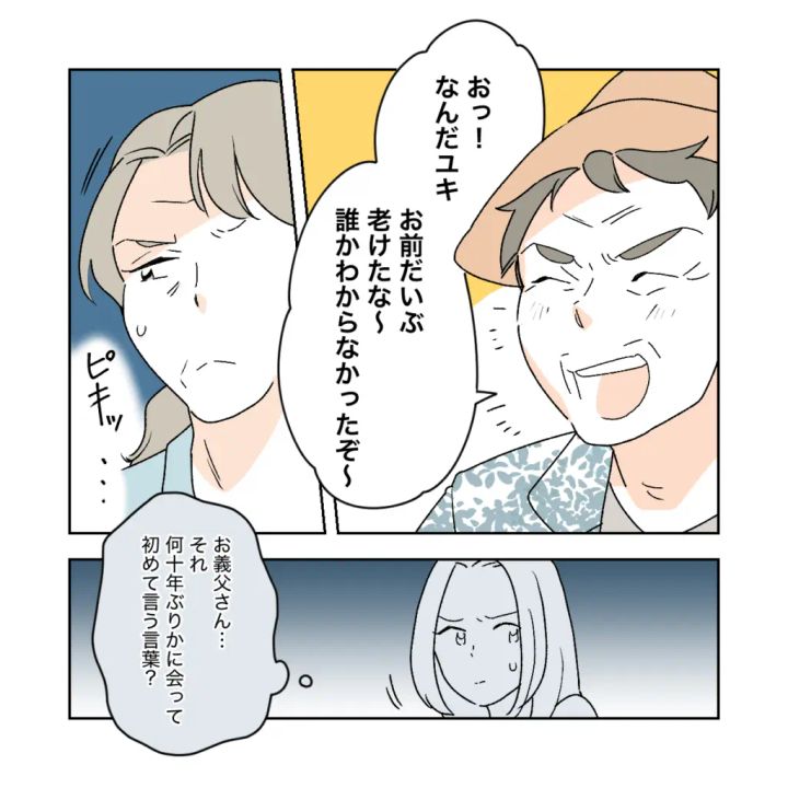 すると義父が義母を見るなり、「おっ!なんだユキ、お前だいぶ老けたな~。誰かわからなかったぞ~」と笑いながら言う義父を見て、怒りをにじませる義母。その様子を見て「お義父さん・・それ、何十年ぶりかに会って初めて言う言葉?」と思っていると、
