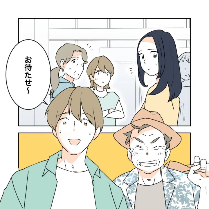 義母や義妹たちと一緒にショウタの帰りを待っていると、「お待たせ~」と笑顔のショウタ。その横にはアロハシャツに帽子スタイルの義父が立っていました。