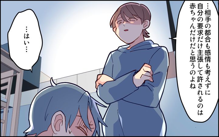 本気で謝り出した夫でしたが、今更感が否めず…。理央さんは「自分の要求だけ主張して許されるのは赤ちゃんだけだと思うのよね」と冷静に告げたのでした。