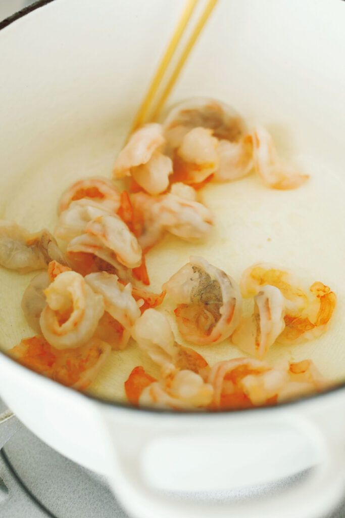 鍋にサラダ油を中火で熱し、えびを入れて1分ほど炒める。酒を加え、煮立たせる。